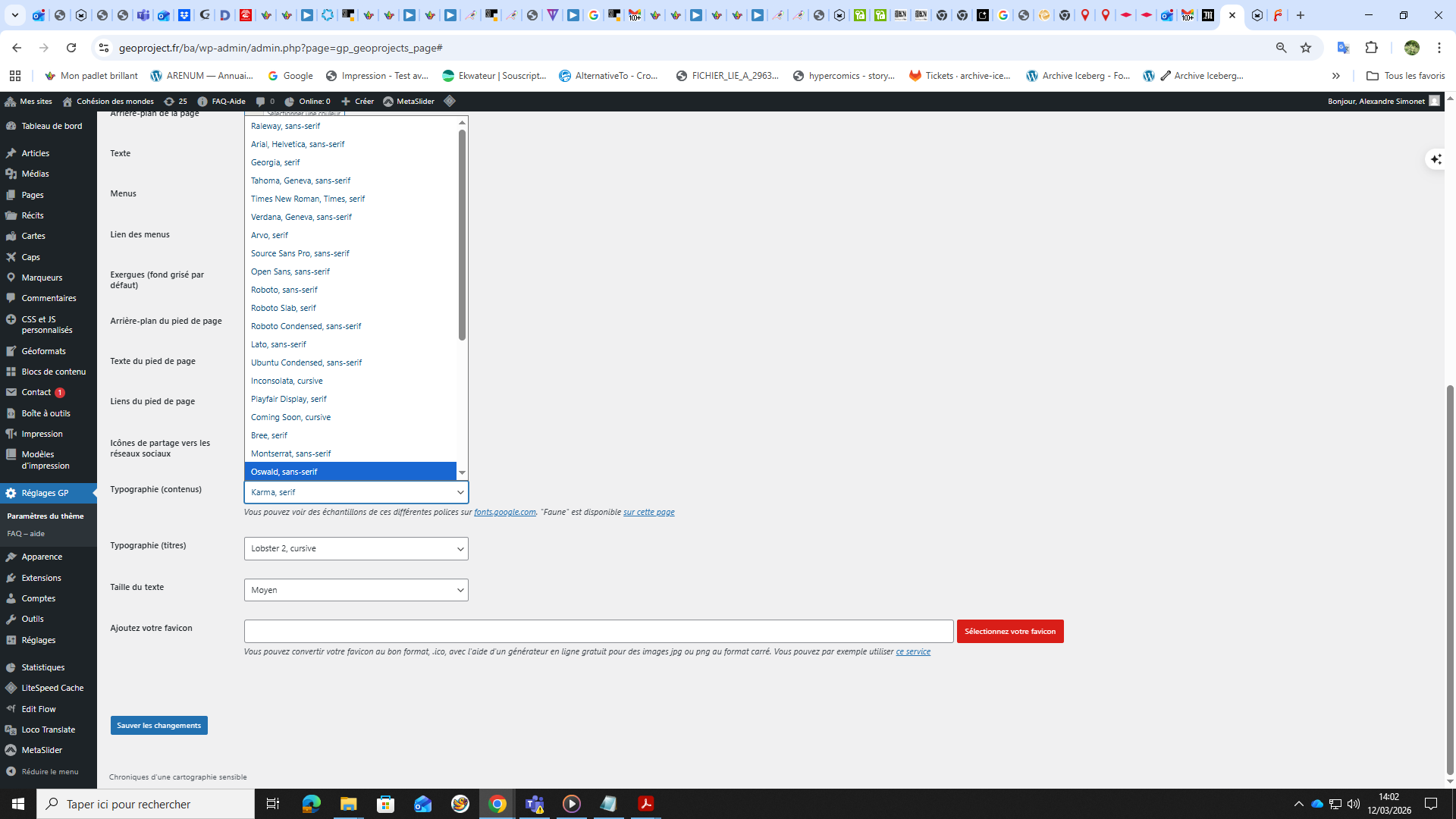 En ce qui concerne le web je peux choisir la couleur de fond uniquement pour projet. Il faudrait que je puisse avoir le même choix des couleurs de fond et /ou motifs sur le récit, marqueur, et géoformat. De même que j'aimerais avoir les même polices que j'avais sur l'ancien site, Je vous joins une copie d'écran Merci à vous. Alex.